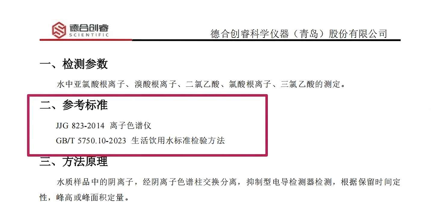 檢測(cè)全程嚴(yán)格遵循兩大權(quán)威標(biāo)準(zhǔn),確保結(jié)果的準(zhǔn)確性與規(guī)范性:一是 JJG 823-2014《離子色譜儀》,為檢測(cè)儀器的性能校準(zhǔn)提供依據(jù);二是 GB/T 5750.10-2023《生活飲用水標(biāo)準(zhǔn)檢驗(yàn)方法》,明確了生活飲用水中相關(guān)物質(zhì)的檢測(cè)流程。
